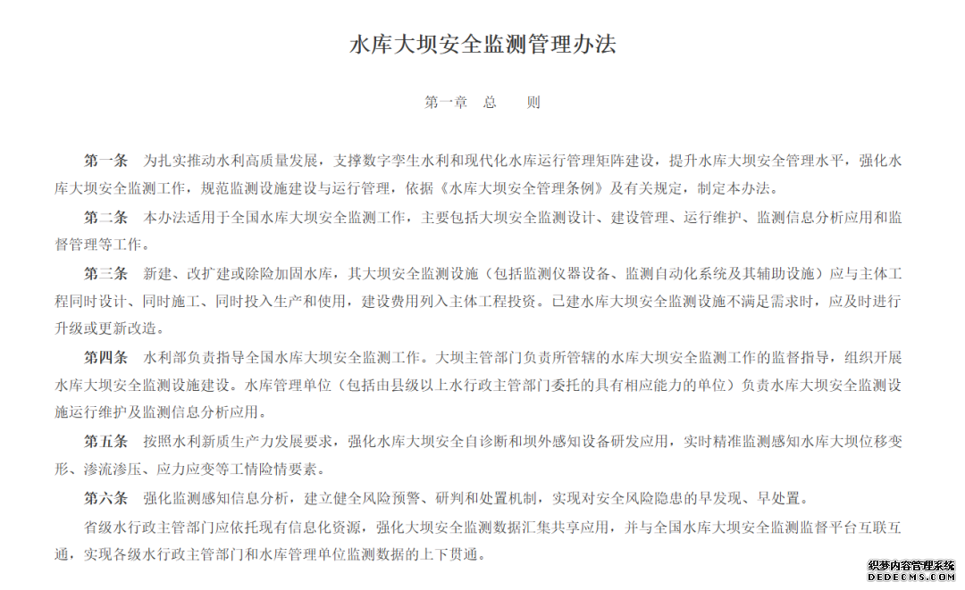 水利部印發的《水庫大壩安全監測管理辦法》為水庫大壩安全監測工作提供了全面、系統的規范指導,是推動水利高質量發展、保障水庫安全運行的重要政策文件。